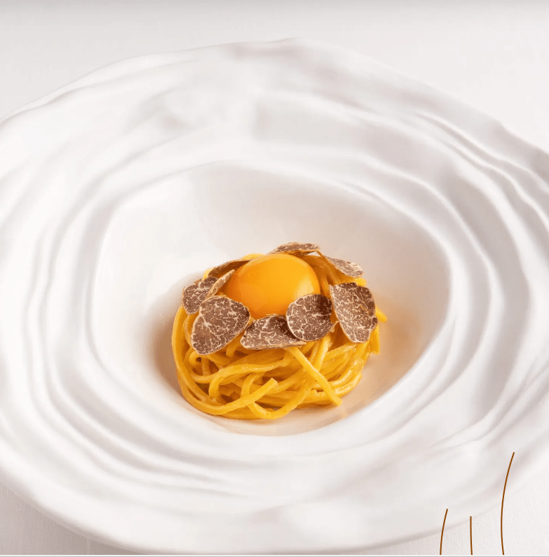 Tallarines hechos a mano, con trufa fresca, yema de huevo y queso Cacio Nerone.