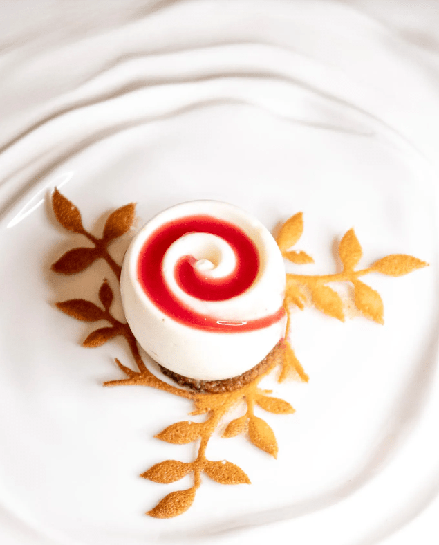 Risotto cacio e pepe, elaborado con arroz Carnaroli biológico, cigala salteada, lima Kafir, polvo de pitaya, arroz crujiente.