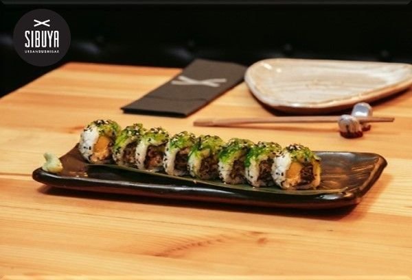 Cebolla tempruizada, queso crema y aguacate cubierto de sésamo, wakame y salsa miel y mostaza.