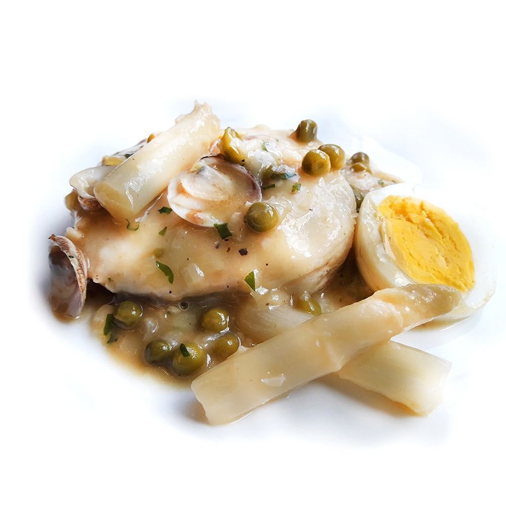 También conocida como merluza a la vasca, la elaboramos con lomos de merluza de anzuelo, almejas, espárragos, huevo cocido y guisantes.